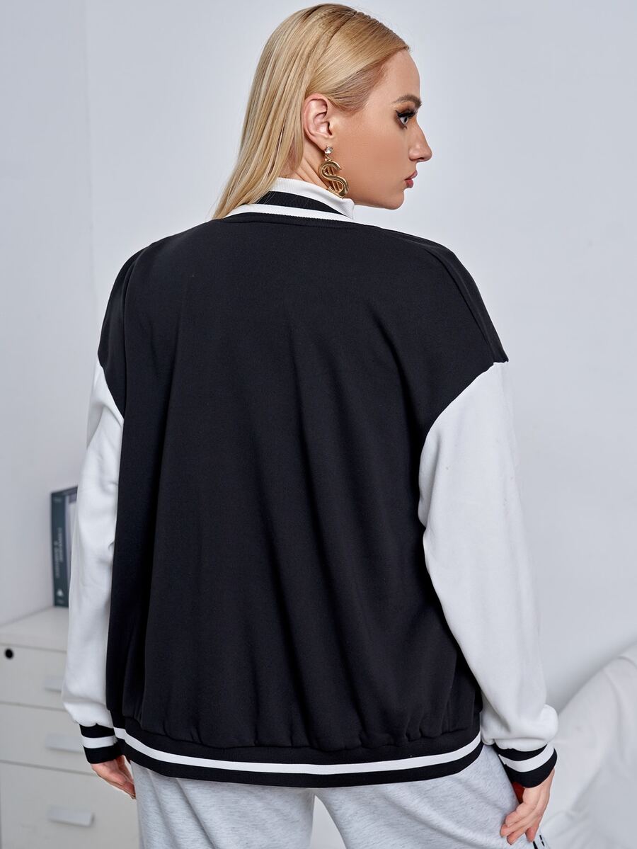 Cazadora de universidad con diseño de parche de letra de hombros caídos de dos tonos