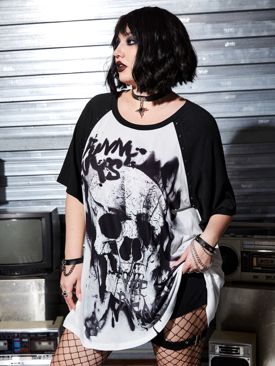 Camiseta de manga raglán con estampado de letra y calavera de talla grande, para la escuela o el verano