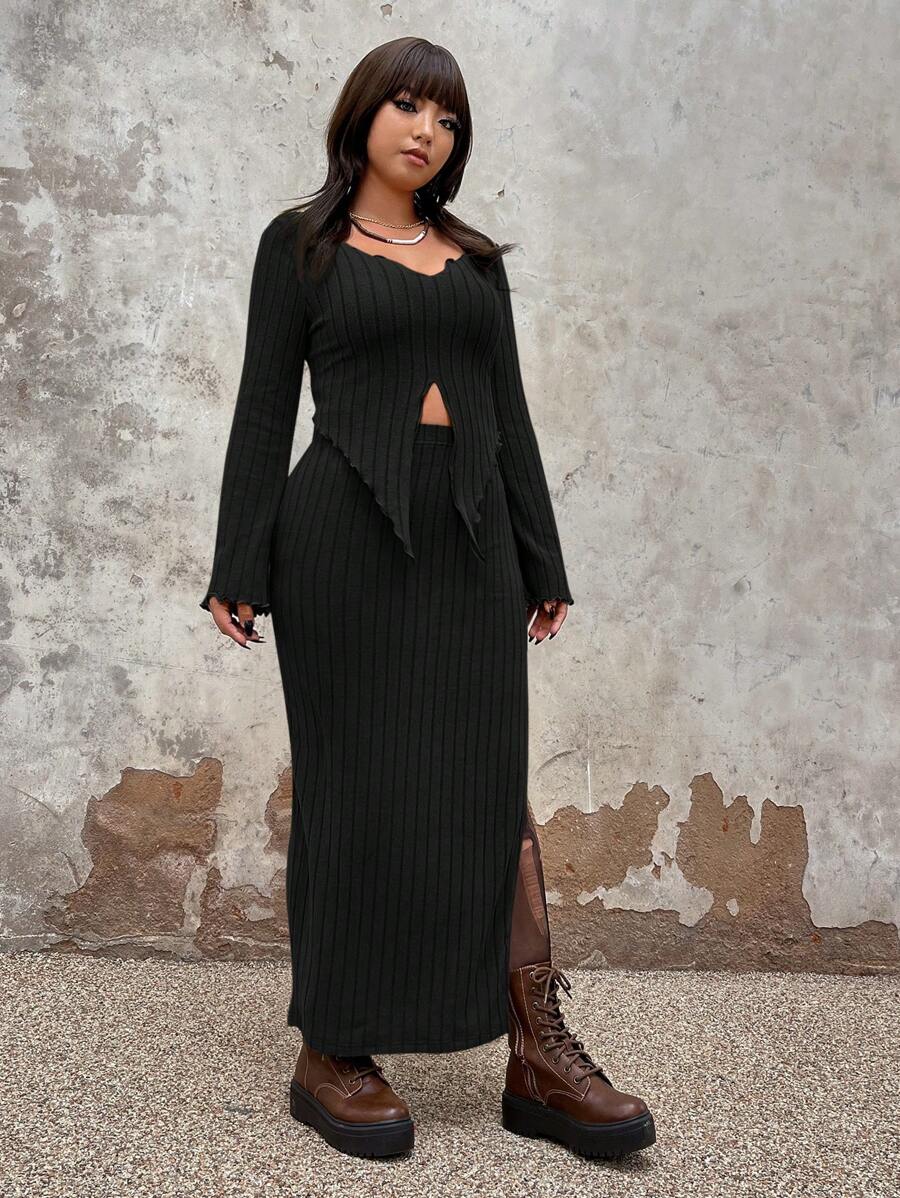 Top corto y falda con dobladillo dividido y ribete de lechuga, para escuela en talla grande