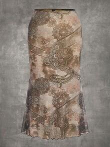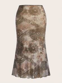 Falda con estampado de paisley ribete en forma de lechuga de malla