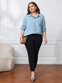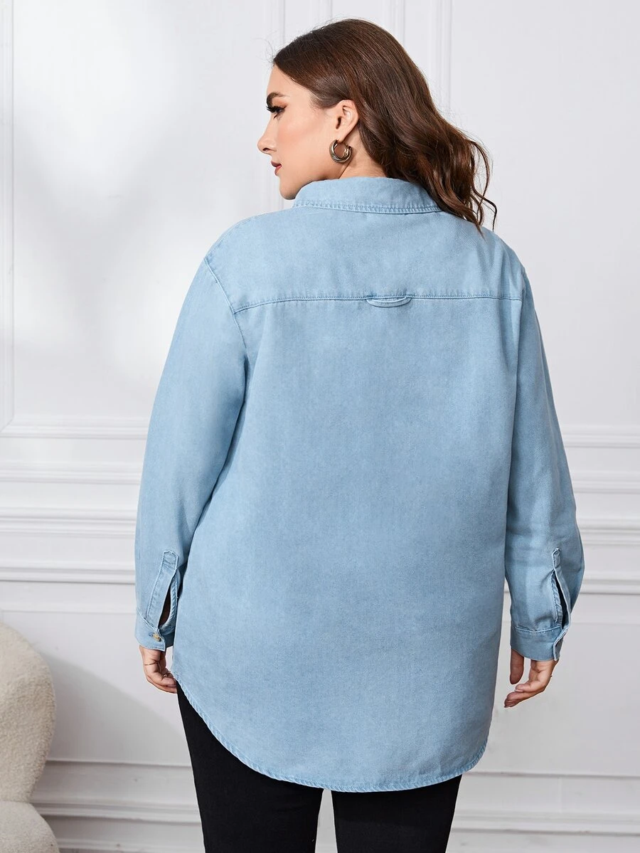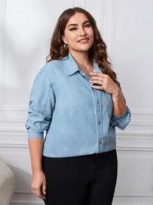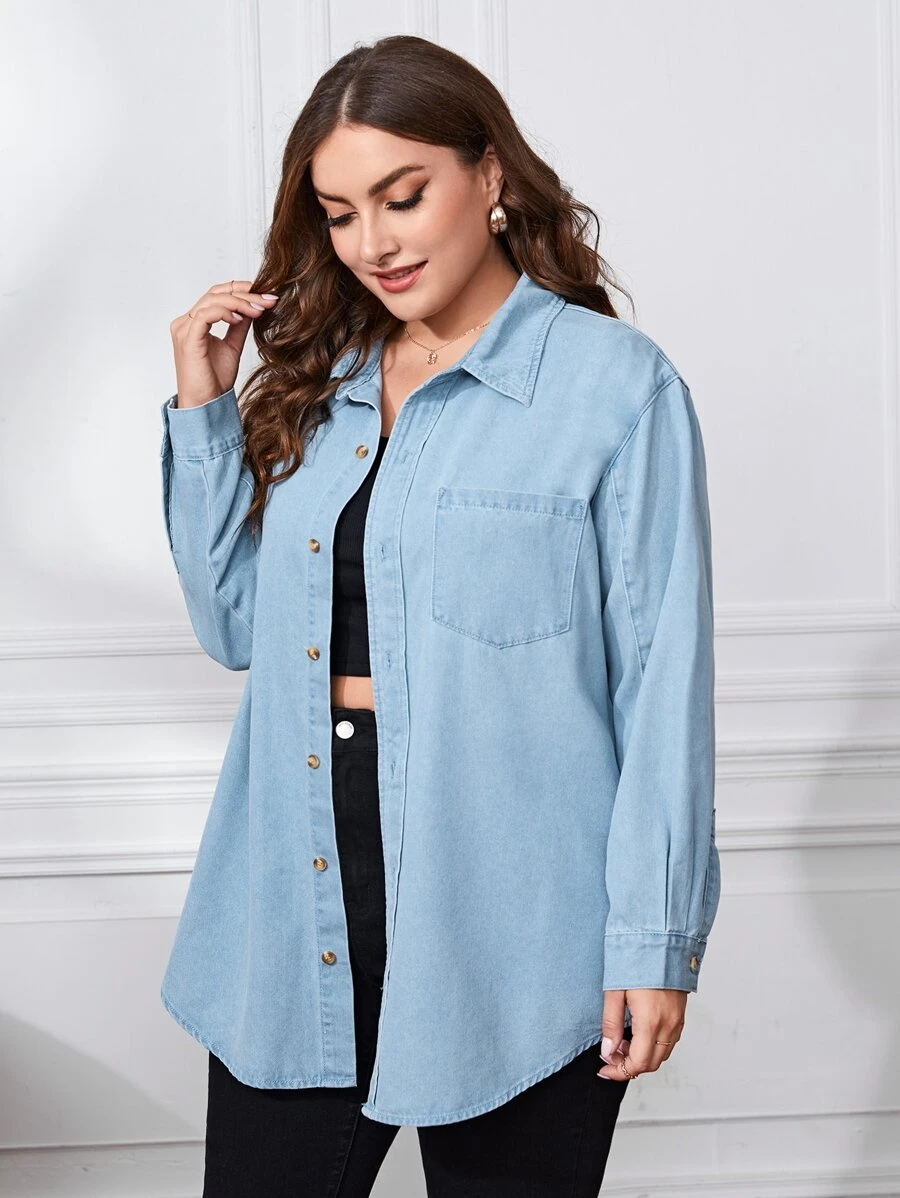 Camisa mezclilla con parche con bolsillo de manga enrollada con botón