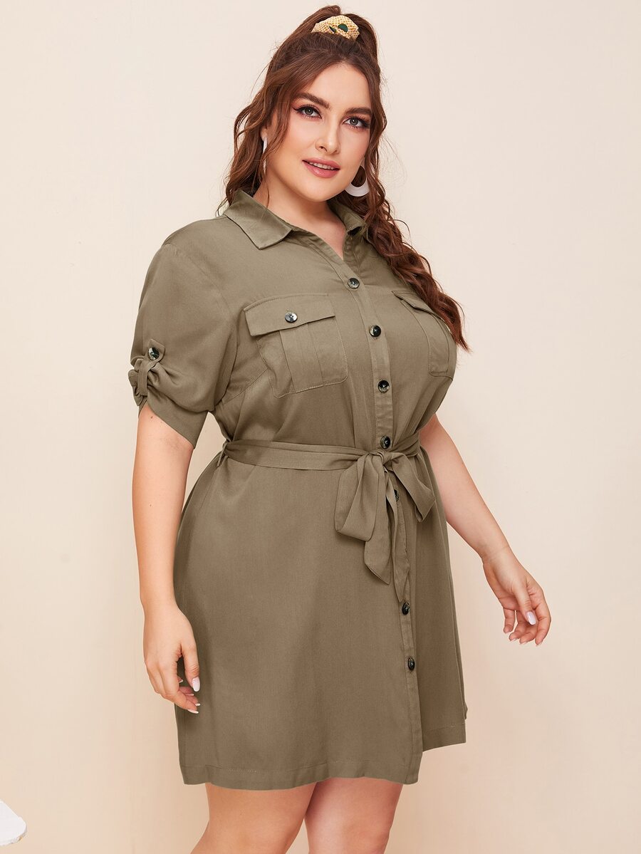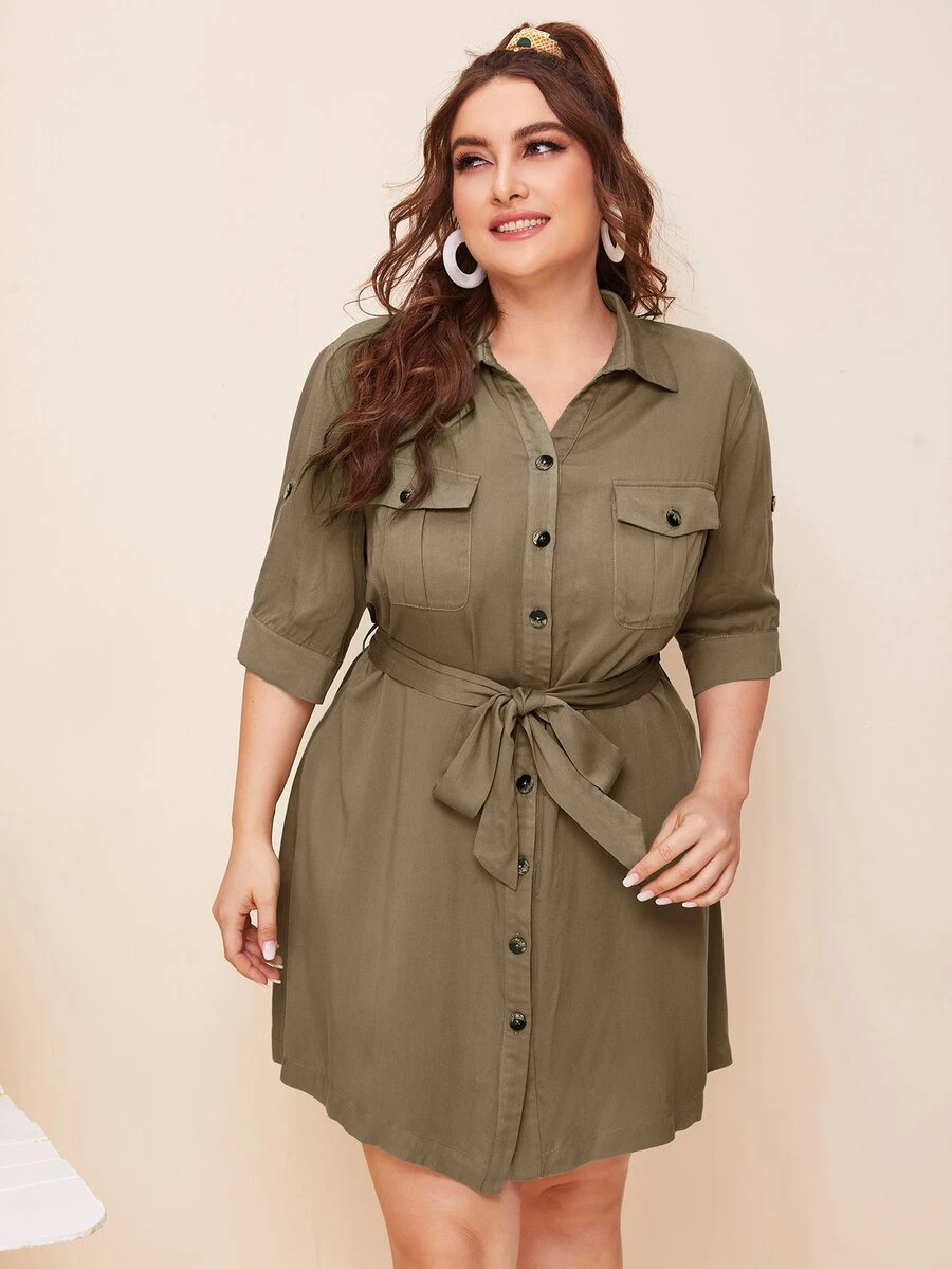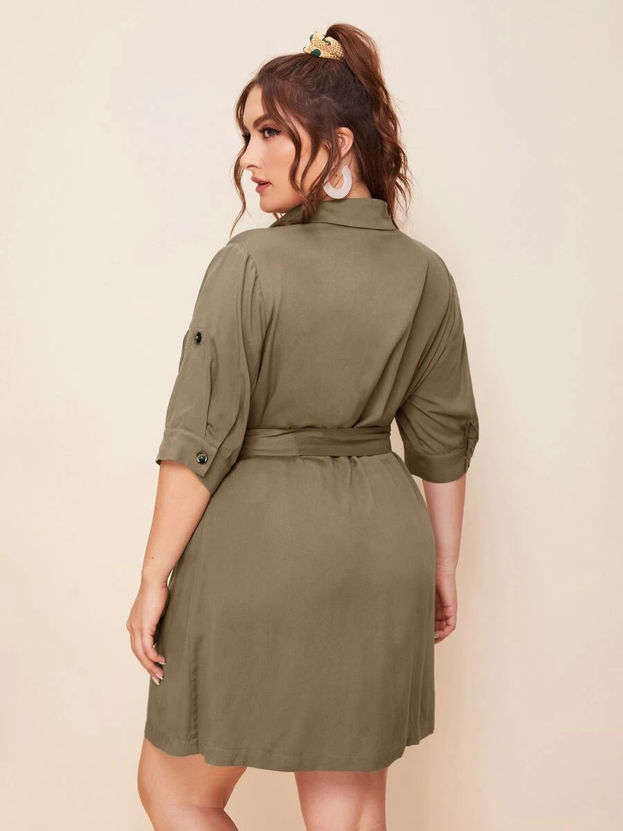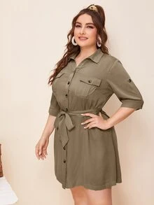 Vestido estilo camisa con cinturón con bolsillo delantero con solapa de manga de doblez
