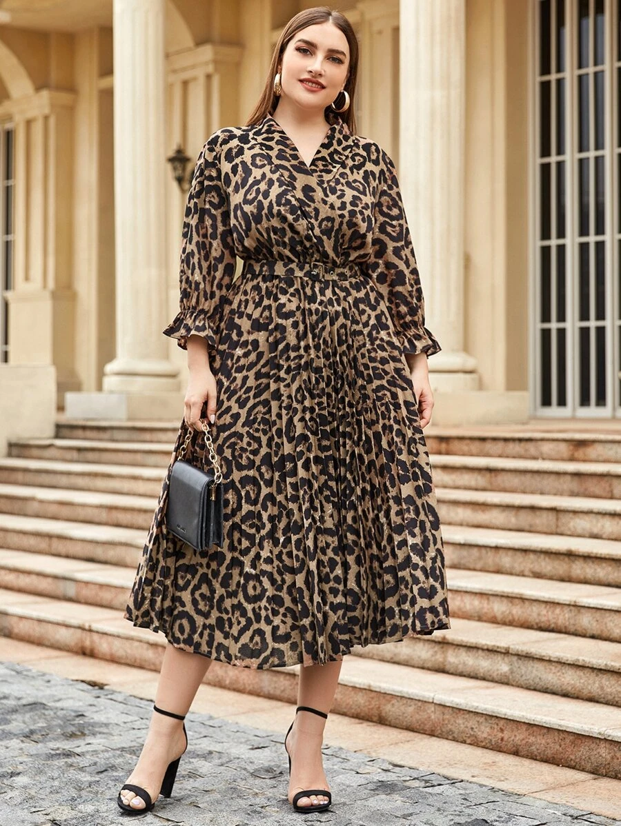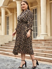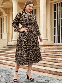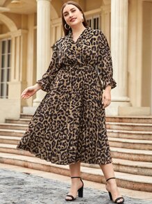 Vestido De Leopardo Grande Con Cuello Shawl, Manga Con Volantes, Dobladillo Plisado, Cinturón Con Hebilla