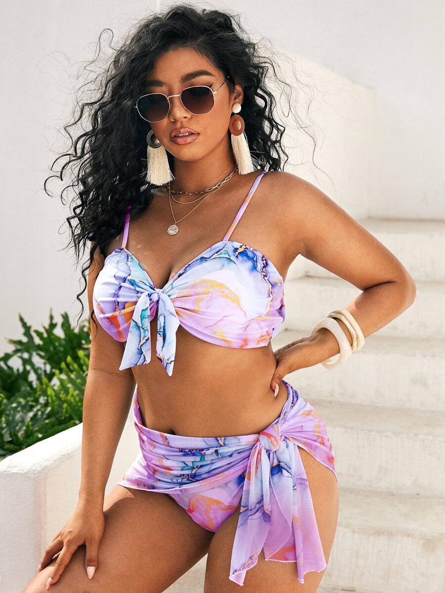 Conjunto de bikini de talla grande de 3 paquetes con estampado de mármol y amarre frontal para verano en la playa