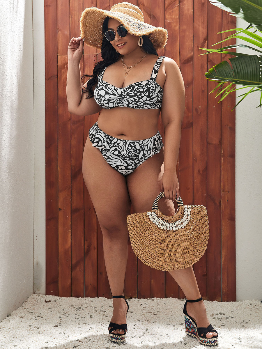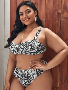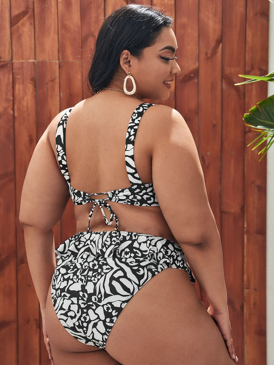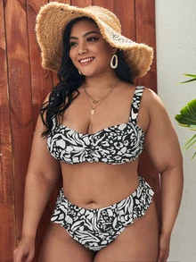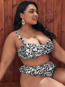 Conjunto de bikini con volantes con estampado total para tallas grandes, playa de verano