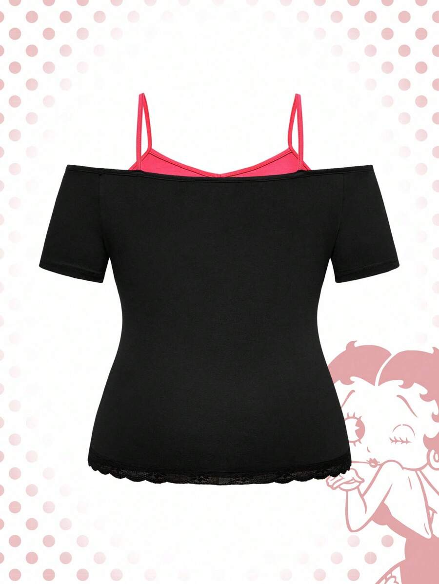 Betty Boop | ROMWE Camiseta de talla grande con figura de dibujos animados, diseño de contraste con lazo de encaje y rhinestones