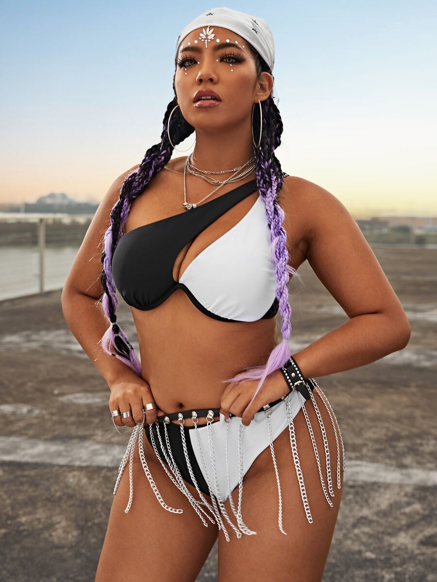 Conjunto de bikini de talle alto con bloque de color y empuje para mujer de talla grande, para playa de verano