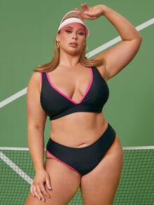 Conjunto de bikini de talla grande con borde de contraste, para playa de verano