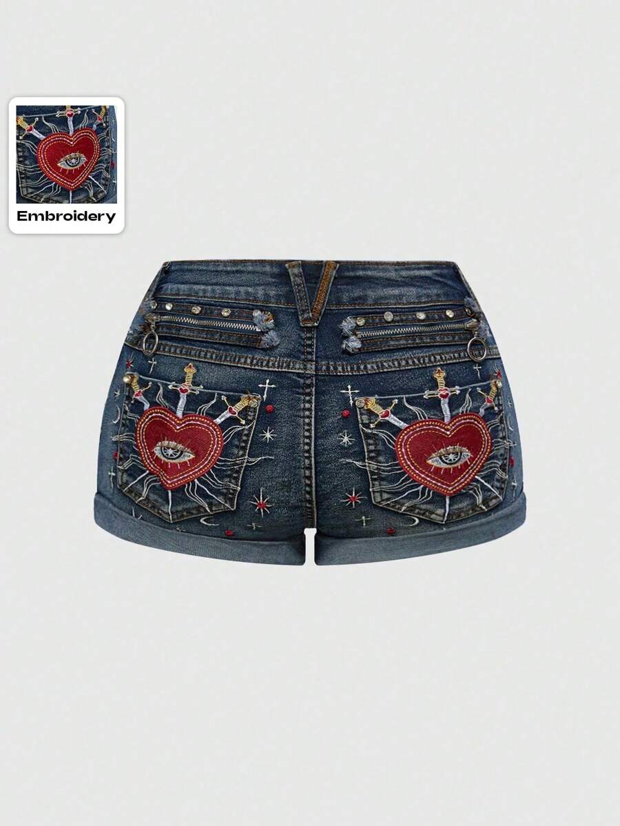 Fairycore Shorts vaqueros de talla grande con cintura baja con detalles bordados de corazón, gemas, cristal y estrella