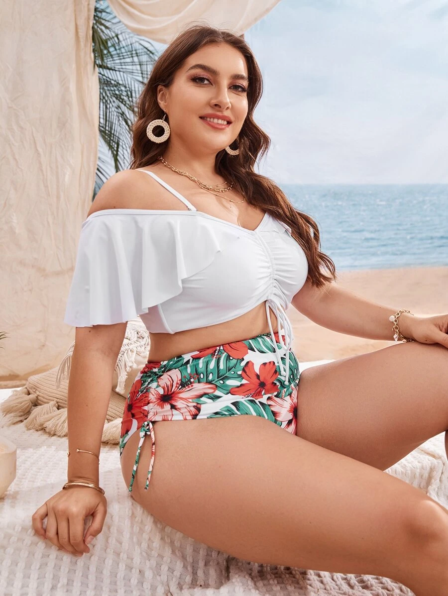 Conjunto de bikini con volantes con estampado floral y tropical para tallas grandes, ideal para la playa de verano