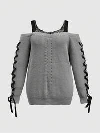 J-Fashion Suéter holgado de punto con encaje y hombros descubiertos de manga larga, talla grande, para otoño/invierno