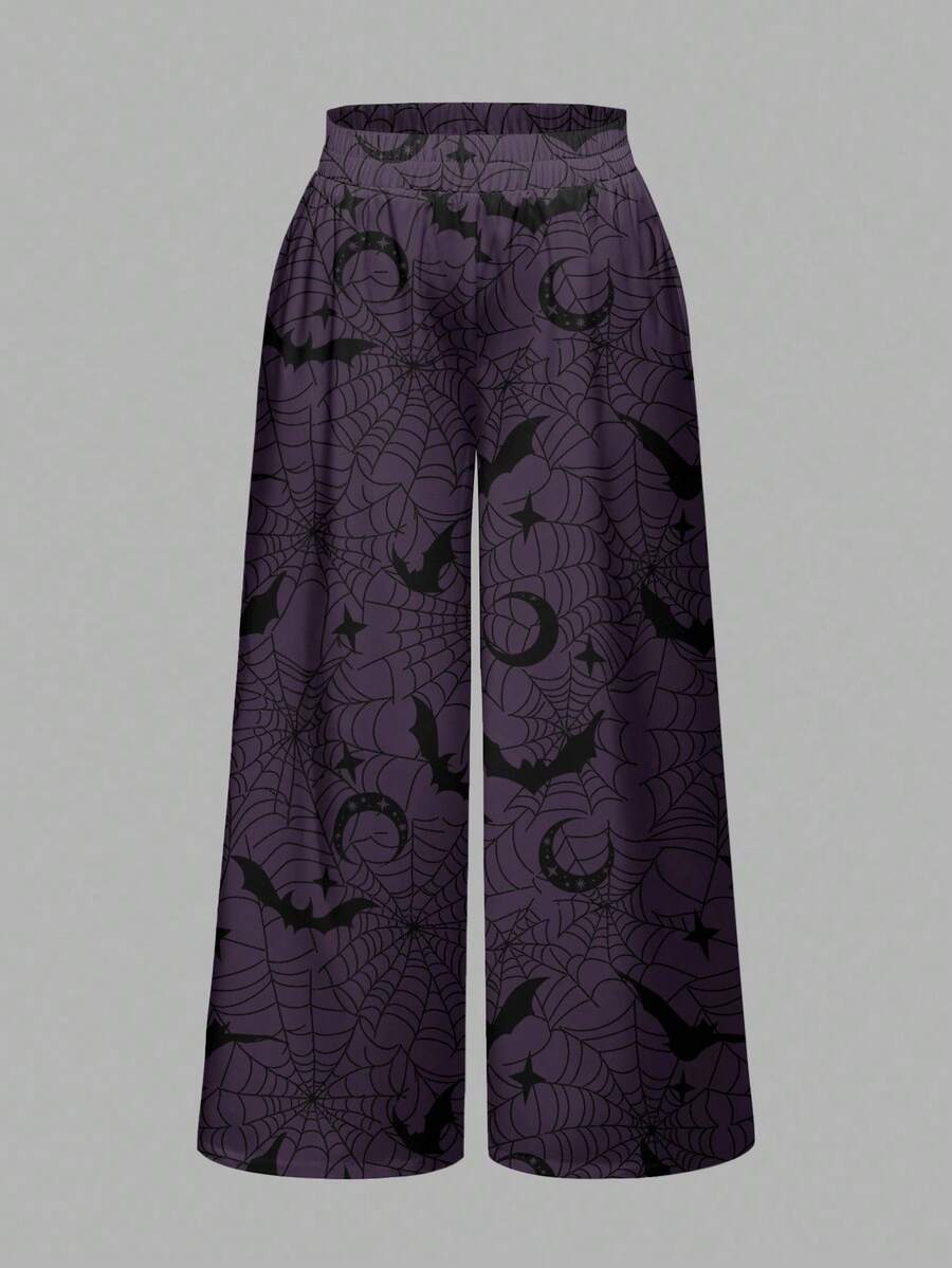 Goth Pantalones anchos y sueltos con estampado todo sobre murciélago, sol, luna, estrella y tela de araña, talla grande, Halloween