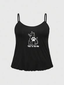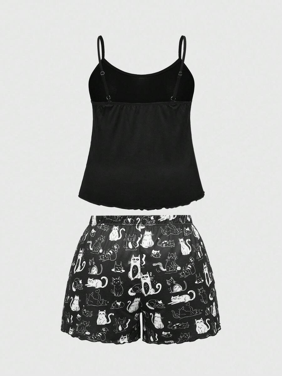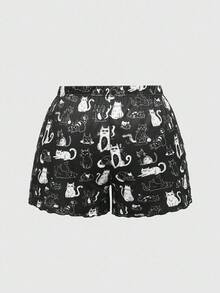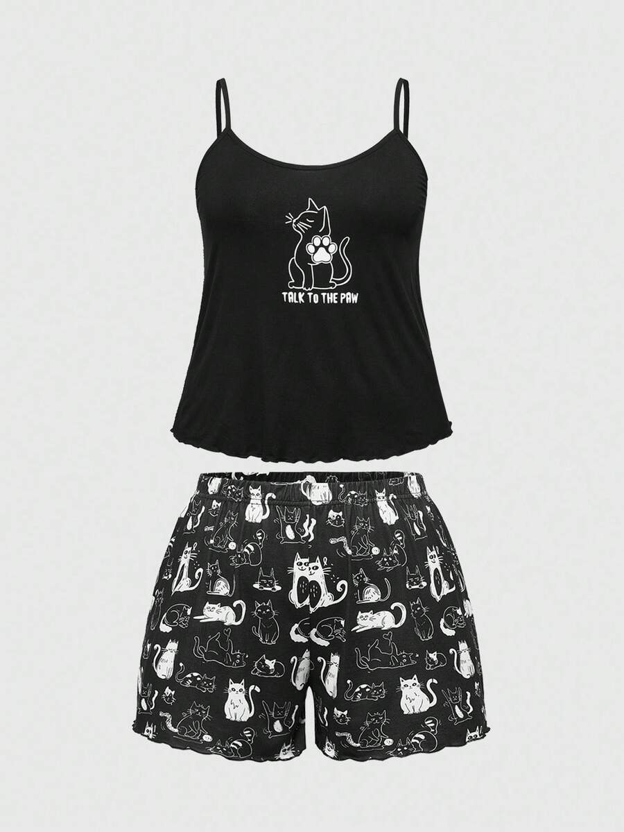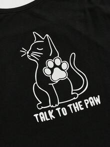 Goth Conjunto de pijama de camiseta y pantalones cortos con estampado de gato, ropa de estar por casa informal para tallas grandes
