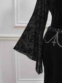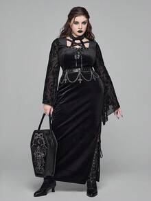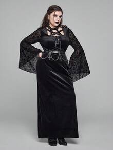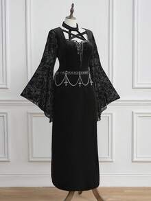EDITION Vestido maxi de talla grande con cuello gótico, halter, estrella de cinco puntas, manga larga asimétrica con volantes, abertura lateral, colgante cruzado y cinturón decorativo, para otoño/invierno. Vestido largo sexy de talla grande con halter para otoño/invierno. Vestido maxi elegante y sexy de estilo gótico de talla grande para fiestas, otoño/invierno.