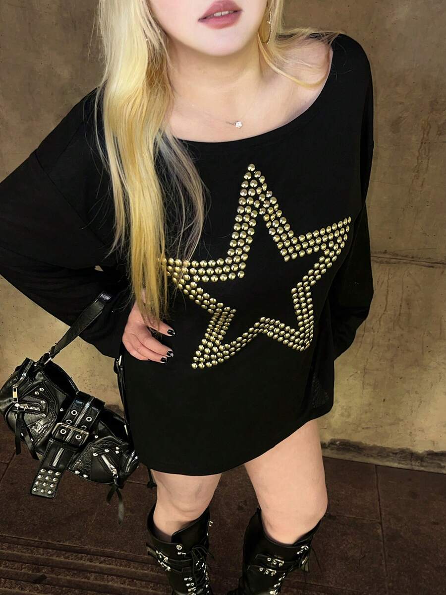 Grunge Punk Camiseta de manga larga con cuello de pico, de talla grande, corte holgado, con estampado de estrella de cinco puntas, remaches y rhinestones, estilo punk