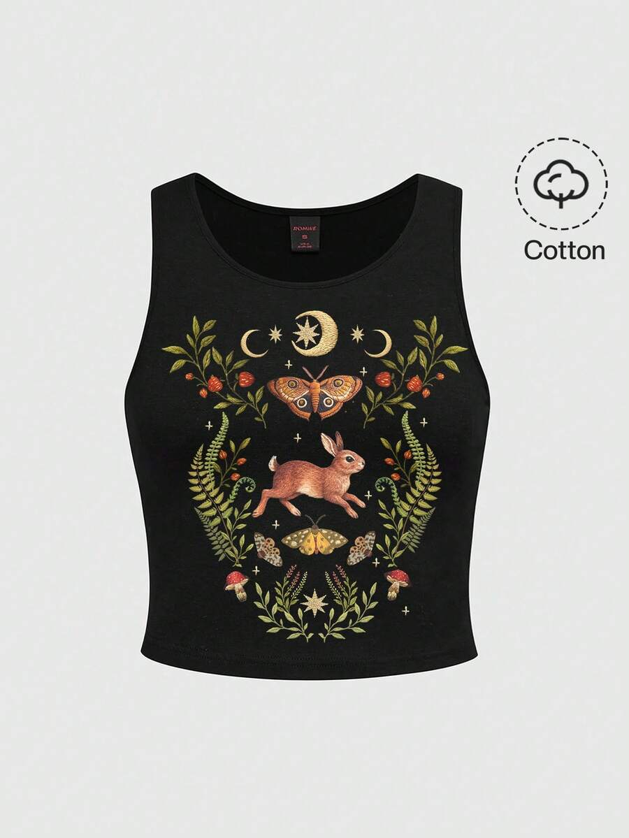 Fairycore Chaleco estilo gótico con estampado de conejo y seta, color negro, talla grande