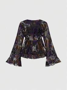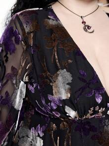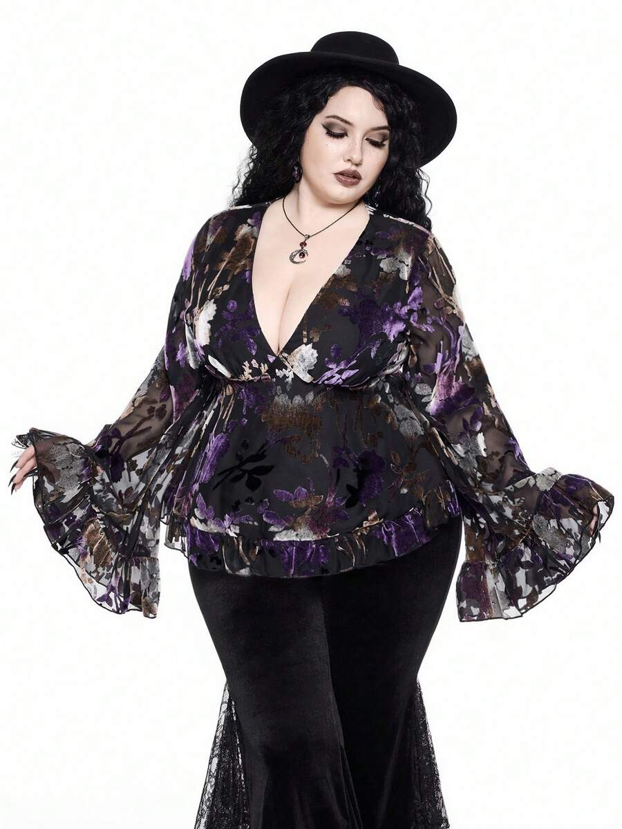 Goth Blusa de manga acampanada con cuello en V, textura de terciopelo con efecto ombre floral y brillo, talla grande