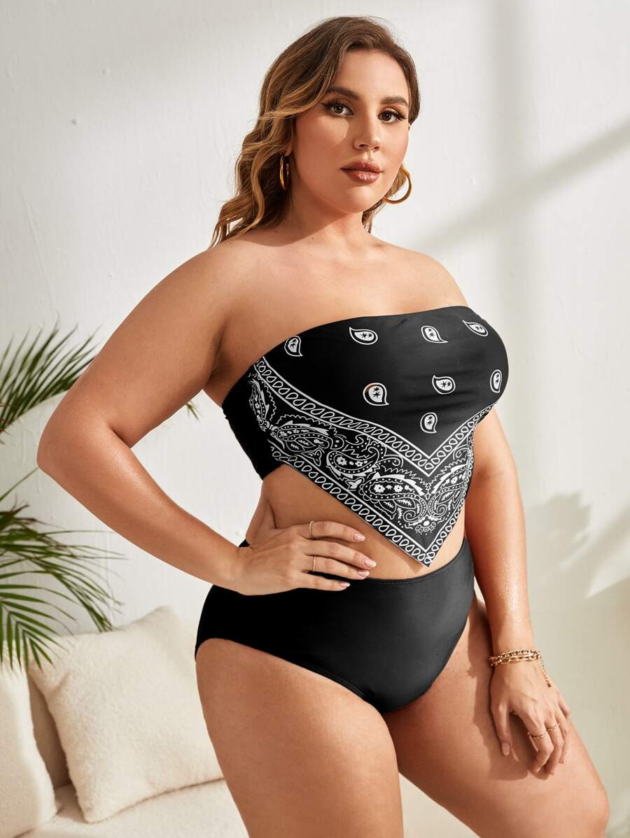 Conjunto De Bikini Con Dobladillo Tipo Pañuelo Y Estampado De Cachemira De Talla Grande Playa De Verano