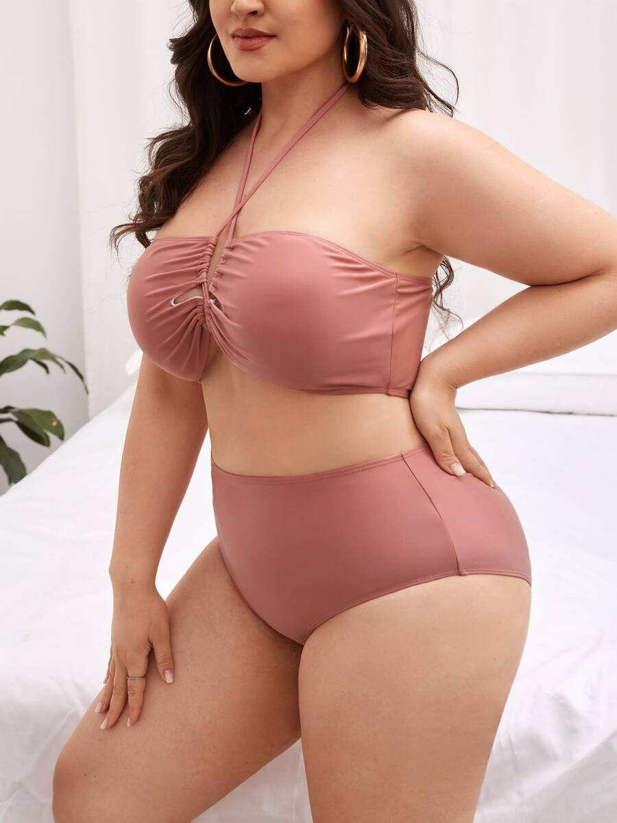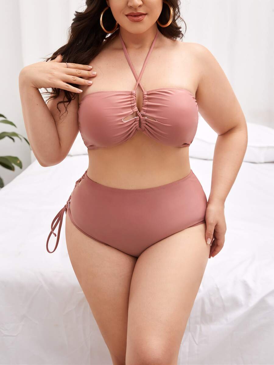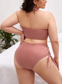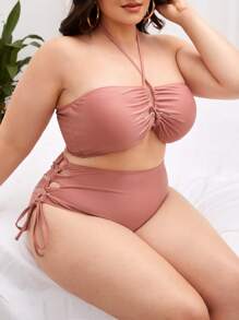 Conjunto de bikini de talla grande con cordones y cintura alta en color liso para verano en la playa