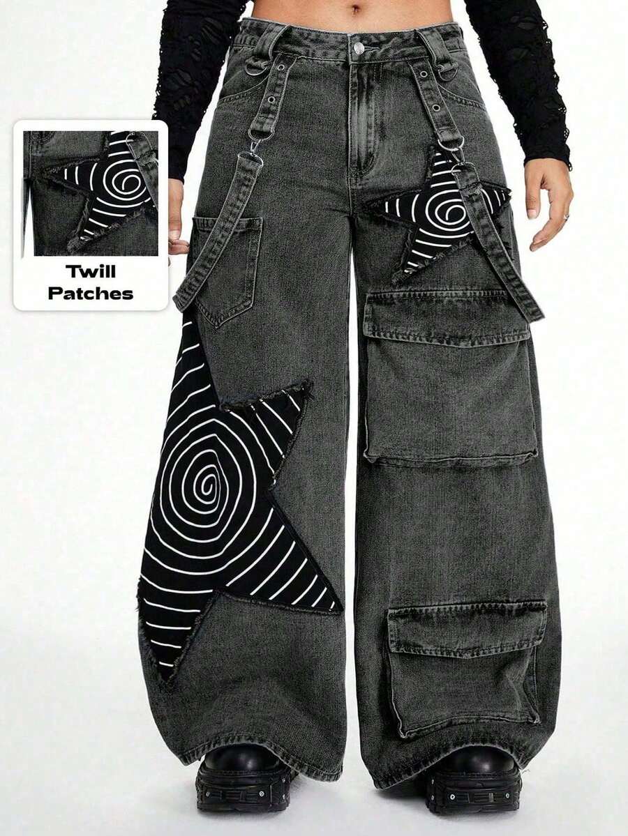 Grunge Punk Pantalones anchos cargo de pierna ancha con estampado de estrella desgastada y lavada en estilo punk, talla grande, para mujer