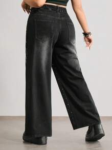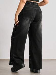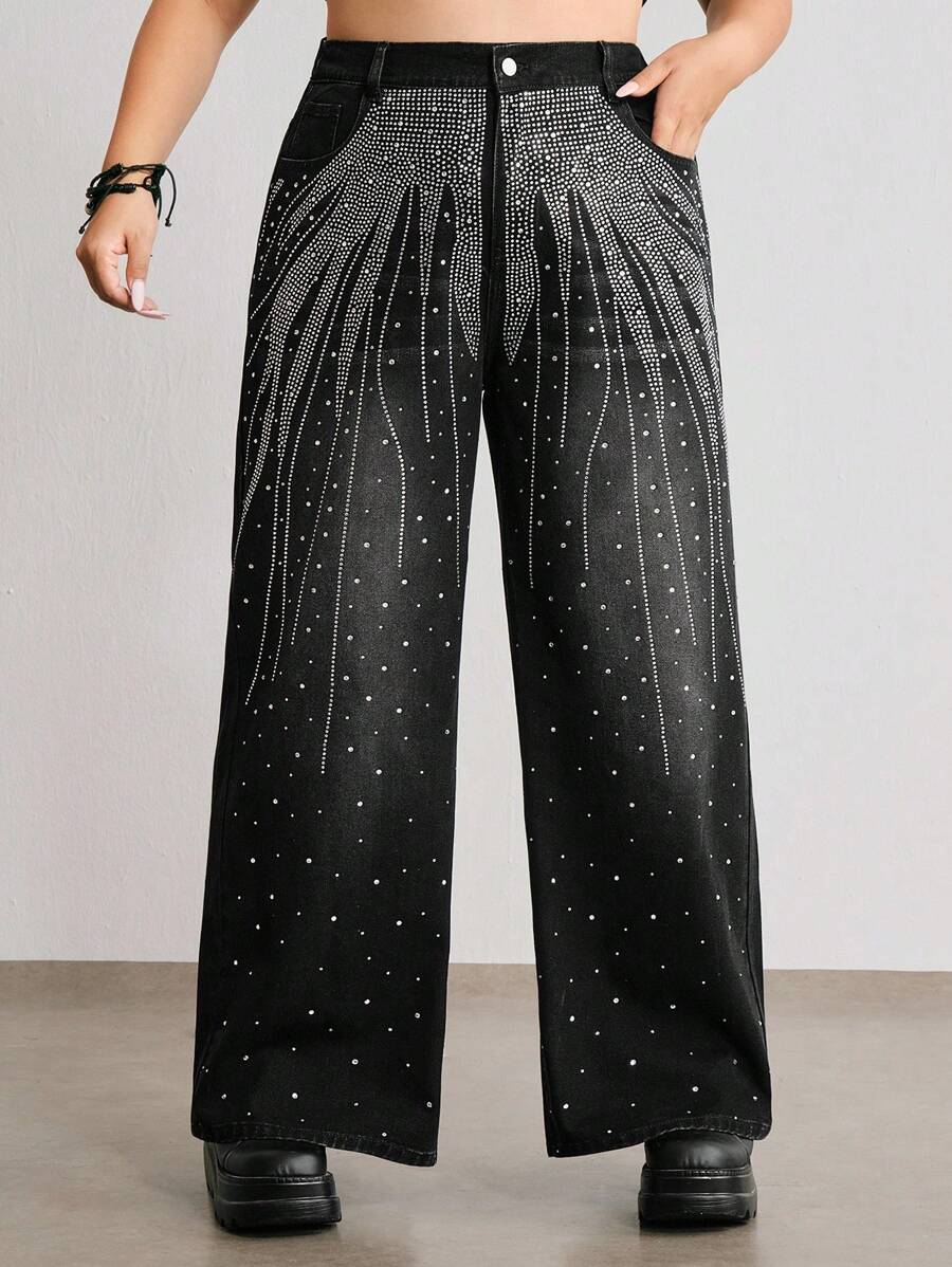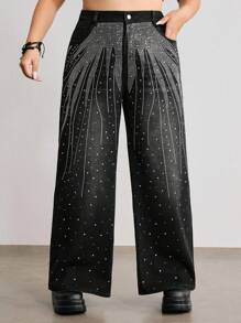 ROMWE Avant Jeans casuales de pierna ancha con bolsillos con decoración de strass para talla grande