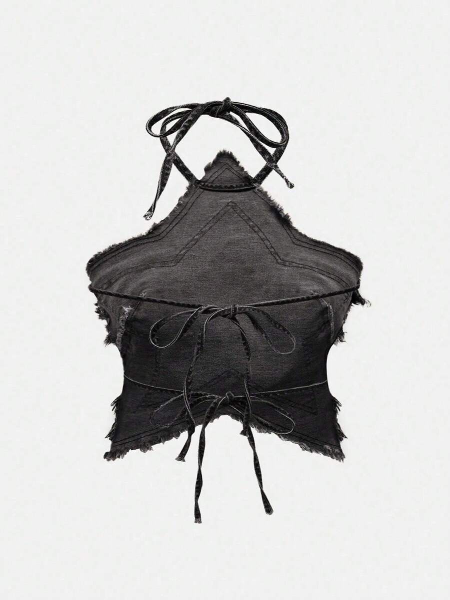 Grunge Punk Blusa de tela vaquera con cuello de corbata, diseño de estrella de cinco puntas desgastada y bajo deshilachado, talla grande y sexy