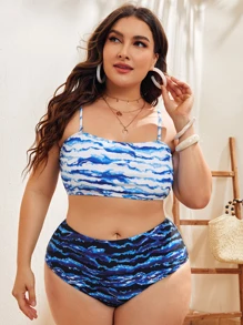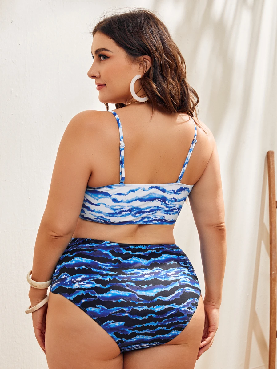 Conjunto de bikini de talla grande con estampado de olas y cintura alta para verano y playa