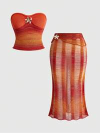 Conjunto de punto de playa de talla grande para mujer con rayas degradadas naranjas y diseño calado de lirio
