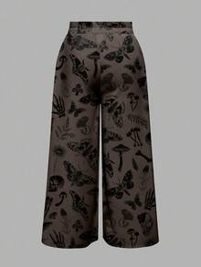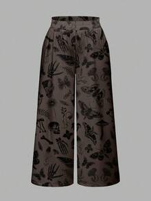 Goth Pantalones anchos y sueltos de talla grande para mujer con estampado gótico oscuro de bruja misteriosa, calavera, polilla, flores, hongos y hojas