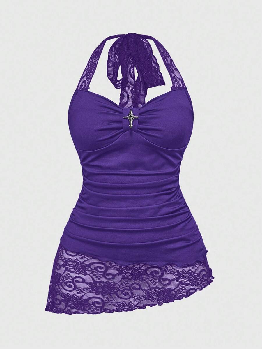 Blusa sin mangas con cuello halter, cintura con lazo y dobladillo asimétrico con aplicaciones de encaje para mujer de talla grande