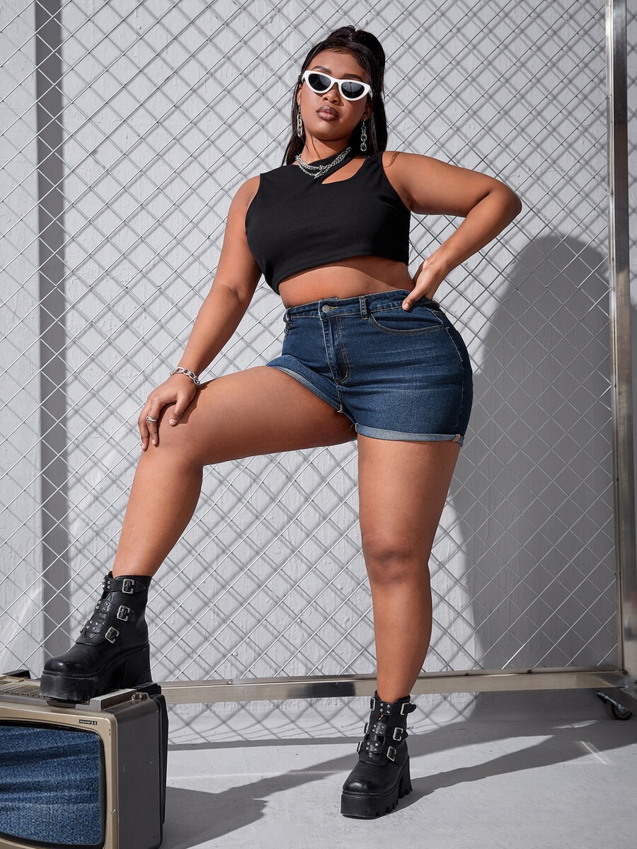 Shorts en mezclilla con bolsillos oblicuos bajo de doblez