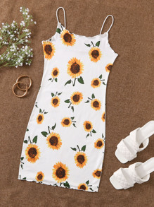 Vestido de tirantes con estampado de girasol ribete en forma de lechuga