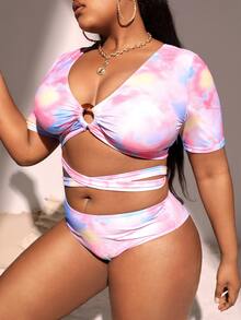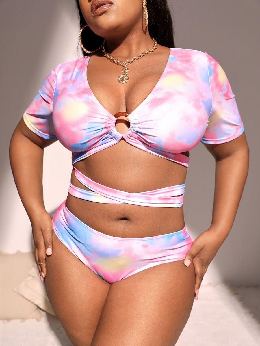 Conjunto de bikini de tallas grandes con estampado de teñido anudado y eslabones de verano para la playa