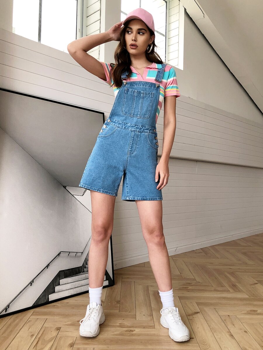 Shorts overol mezclilla con bolsillo con parche de pierna ancha