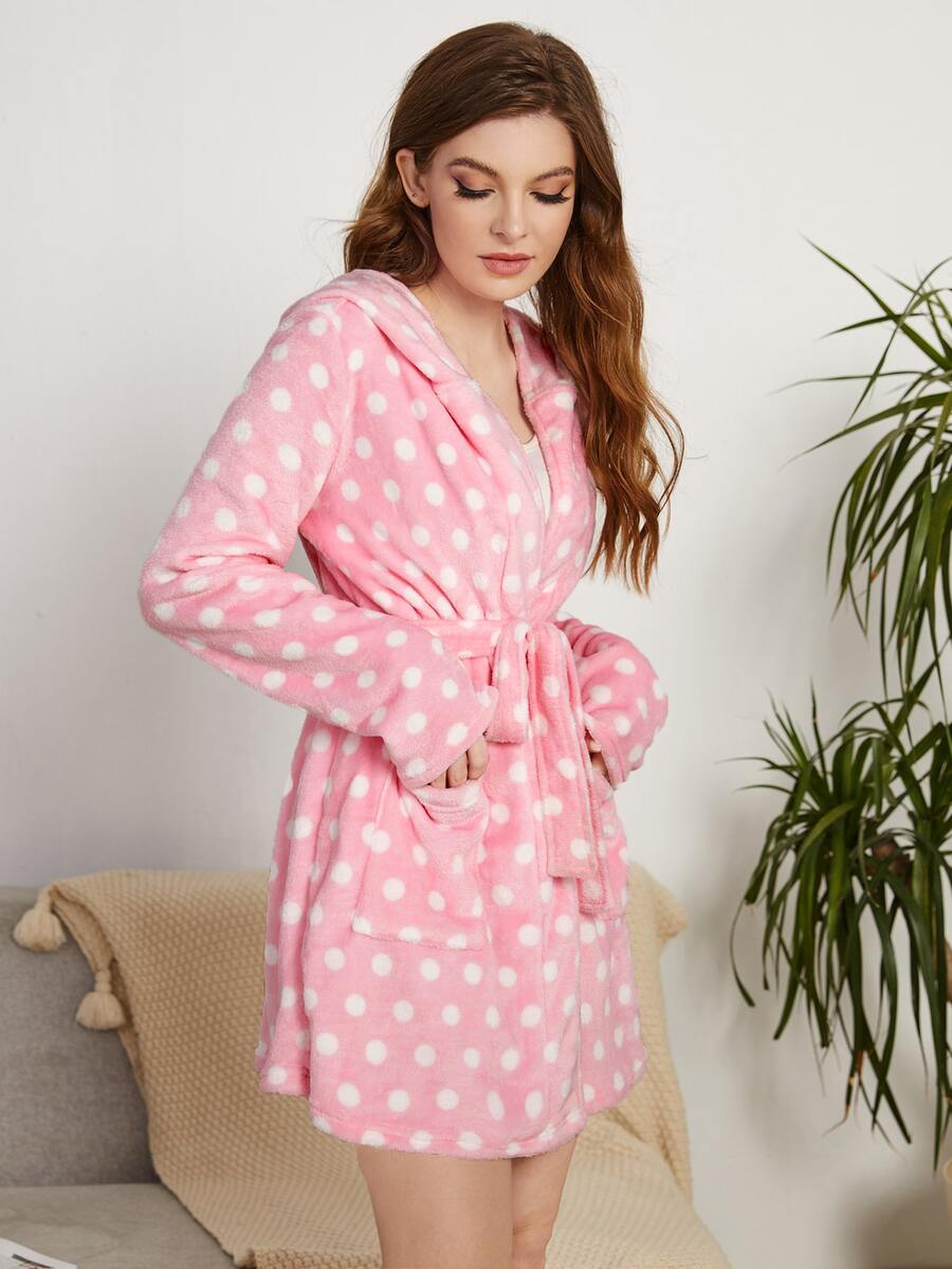 Bata de noche con estampado de lunares con parche de bolsillo con capucha con cinturón de franela