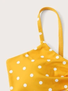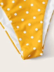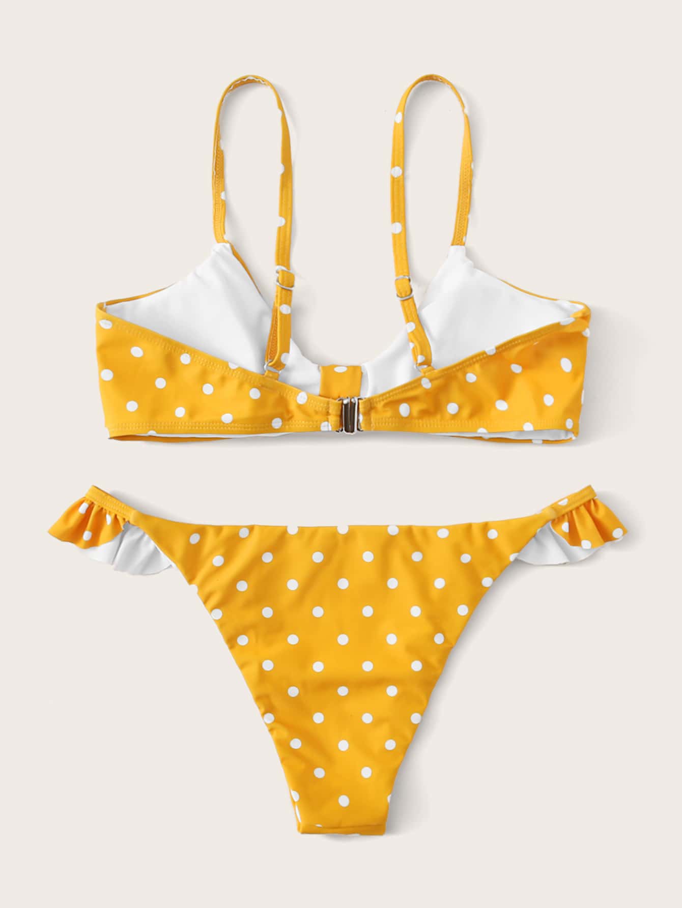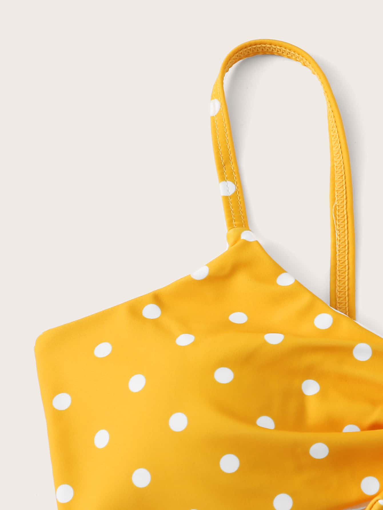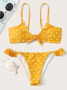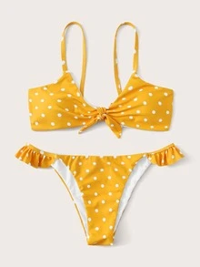 Conjunto de bikini tanga con estampado de lunares y ribete de volantes para verano en la playa