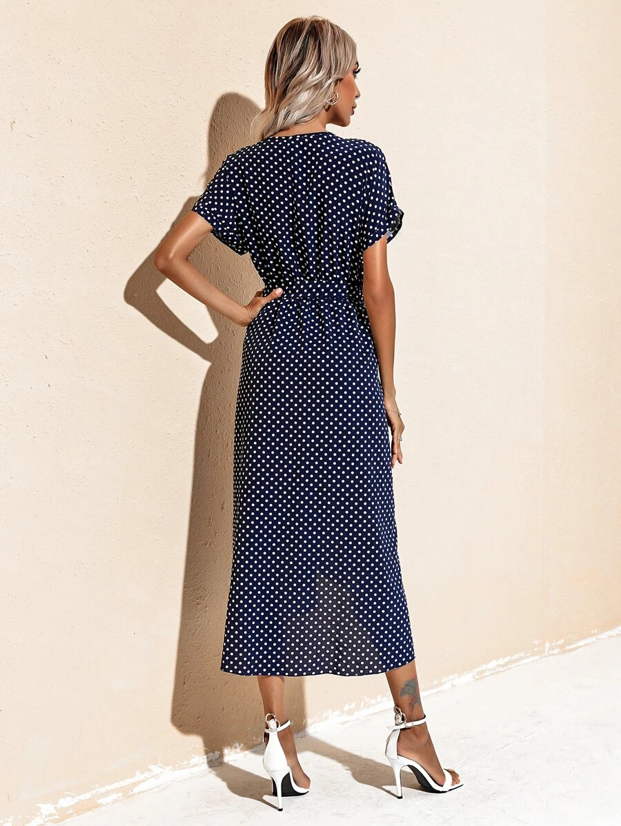 Vestido con cinturón de lunares cruzado delantero