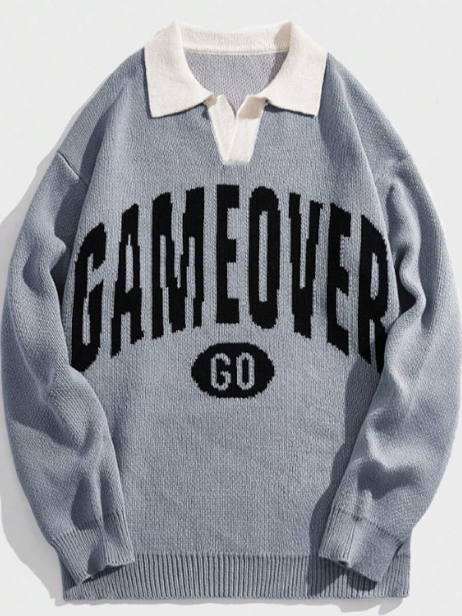 Prep Sudadera Para Hombres Con Patrón De Letras Y Cuello De Contraste