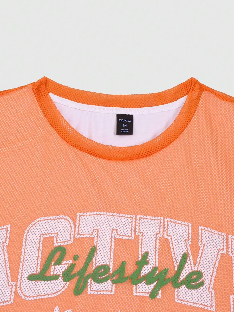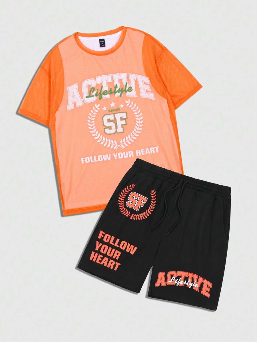Prep Conjunto de camiseta de manga corta con cuello redondo y estampado de letras en malla y shorts para hombres
