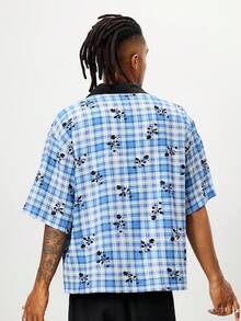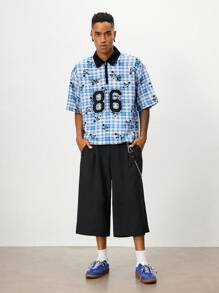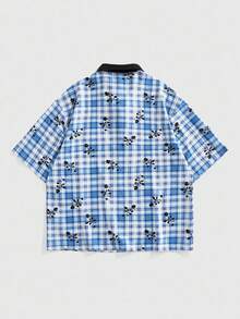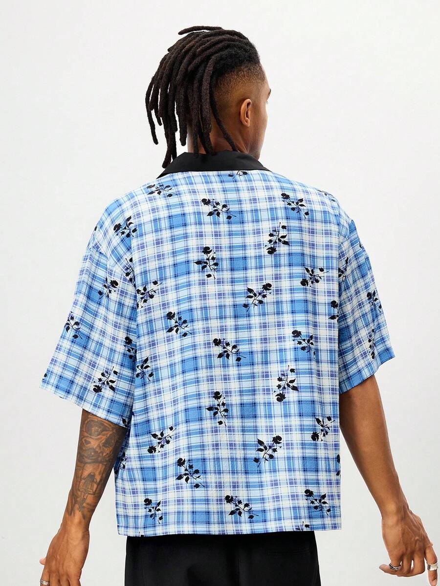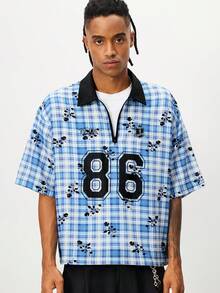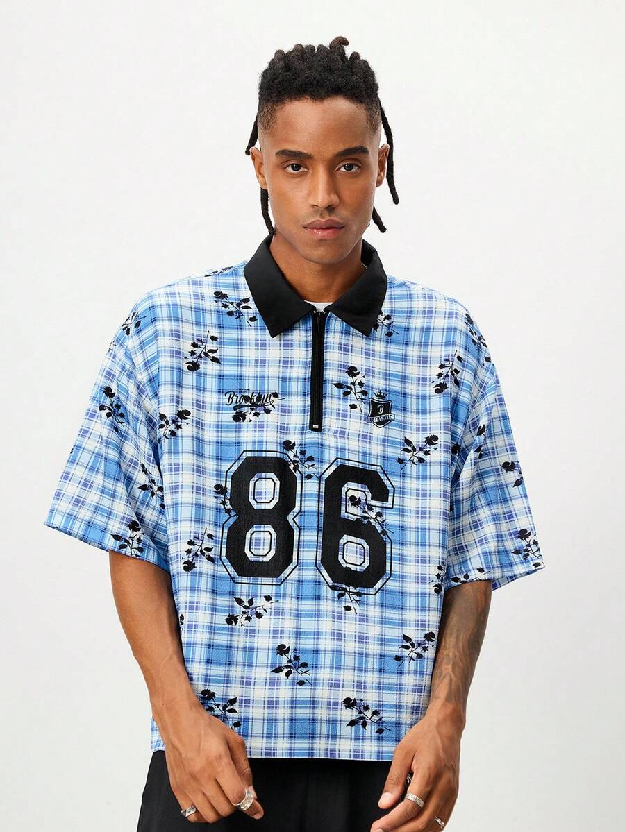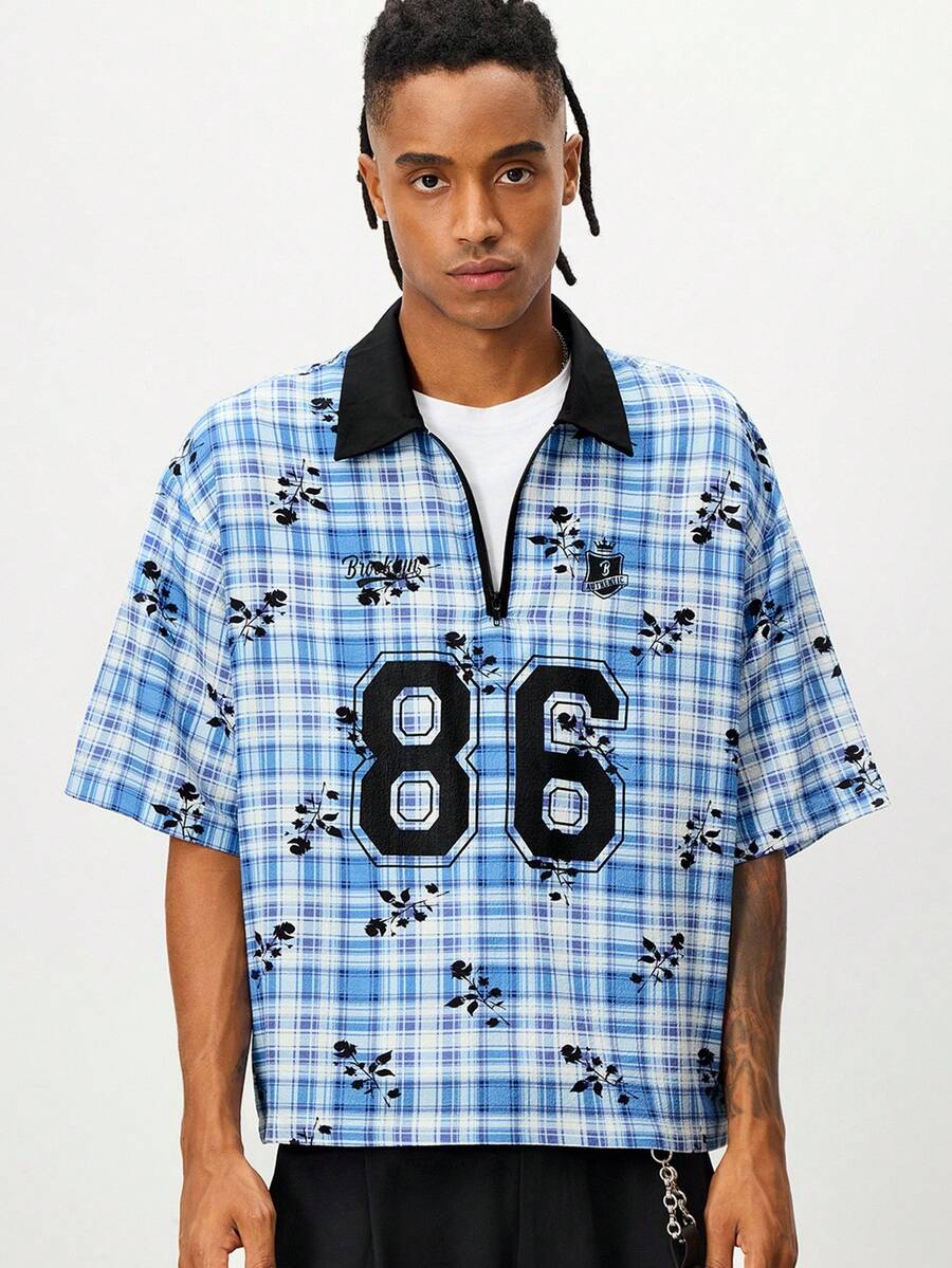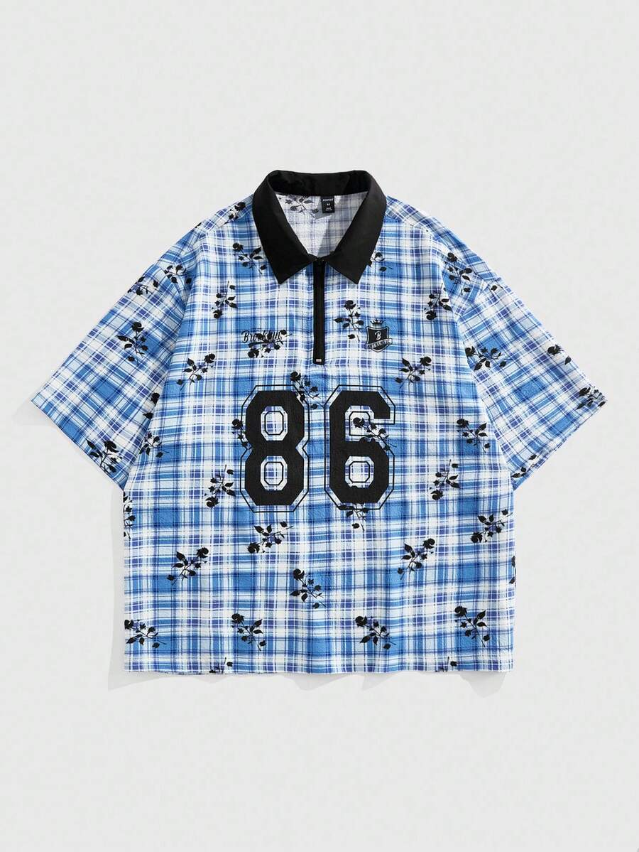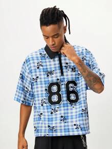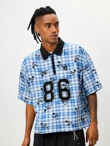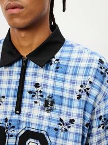Prep Camisa polo de manga corta con estampado de cuadros, flores y números para hombres