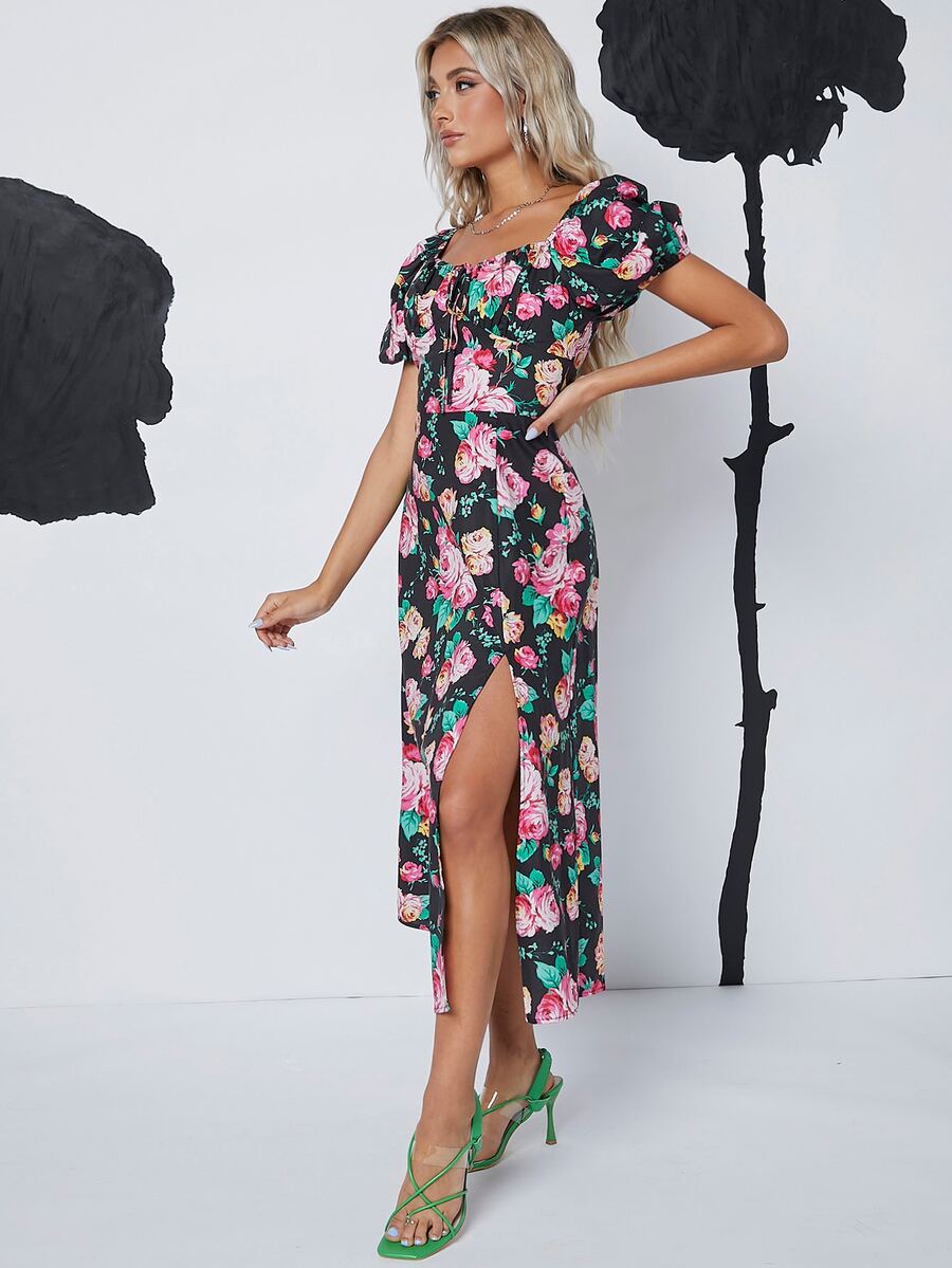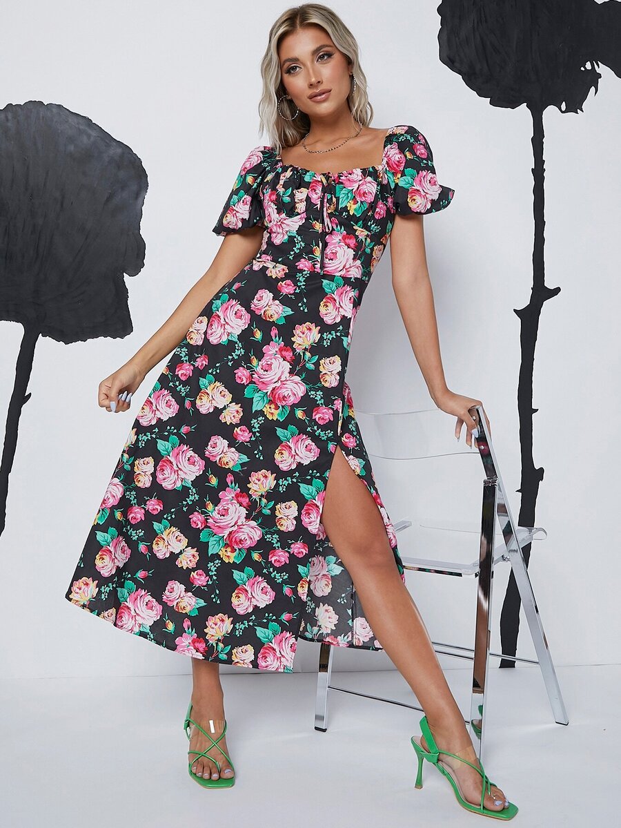 Vestido Impreso Floral Con Mangas Abombadas, Lazo Delantero Y Abertura En El Muslo
