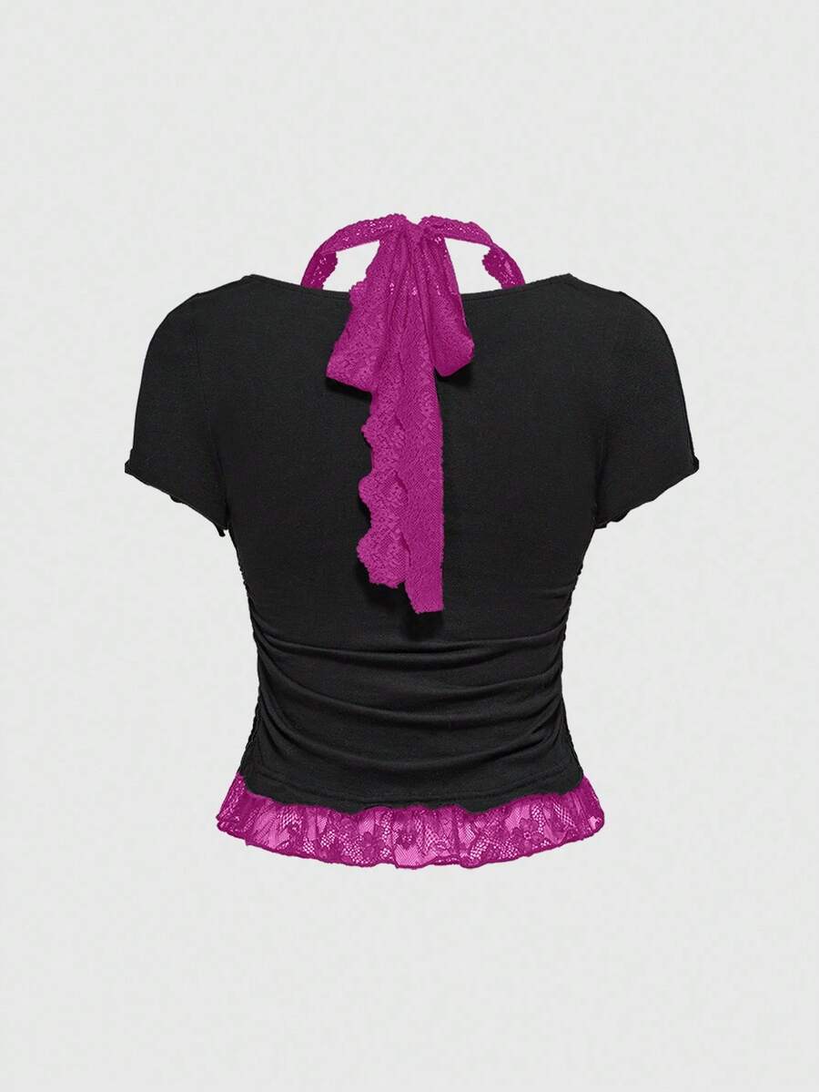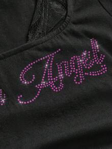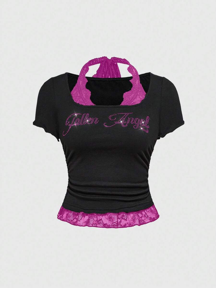 Grunge Punk Camiseta ajustada de mujer con cuello redondo, parches de strass y encaje con diseño de letras "Punk Bro"