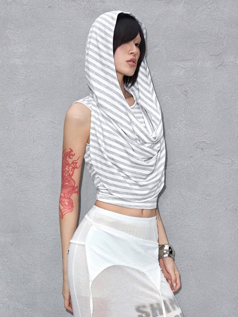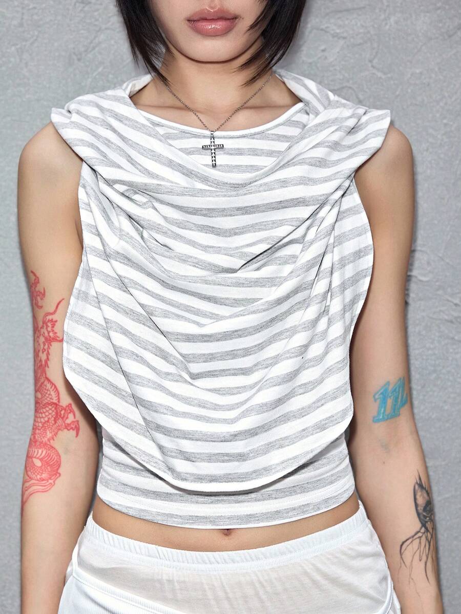 ROMWE Avant Sudadera con capucha de cuello alto a rayas Avant, top corto de estilo streetwear Y2K para mujeres