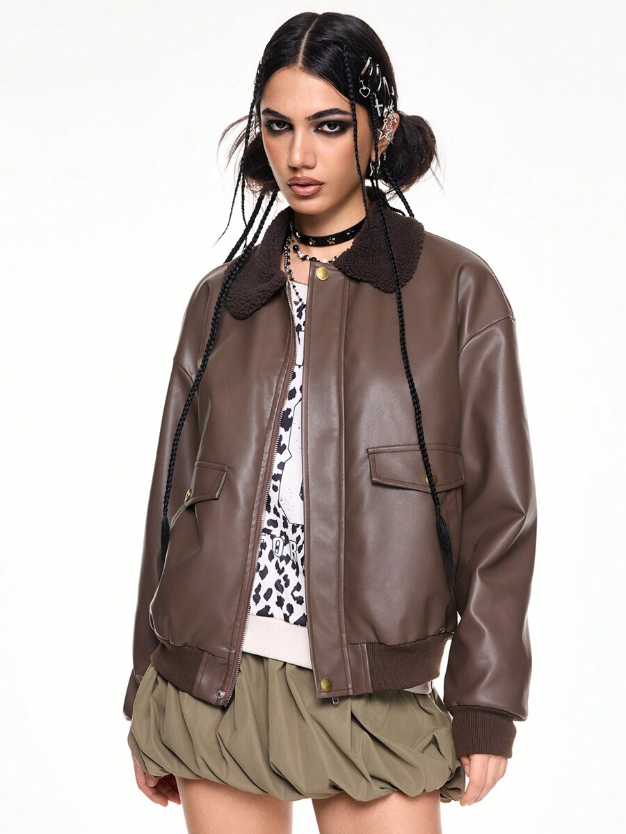 ROMWE Avant Chaqueta baseball de manga larga con cuello de piel sintética para mujer, Downtown Girl, para otoño/invierno