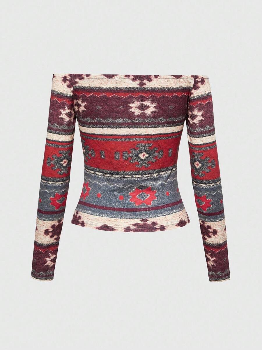 ROMWE Avant Camiseta de mujer de manga larga con estampado de Fairisle y patchwork de punto