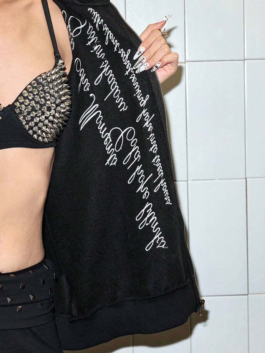 ROMWE Avant Sudadera con capucha de corte holgado con bordado de eslogan y cruz, forrada térmicamente