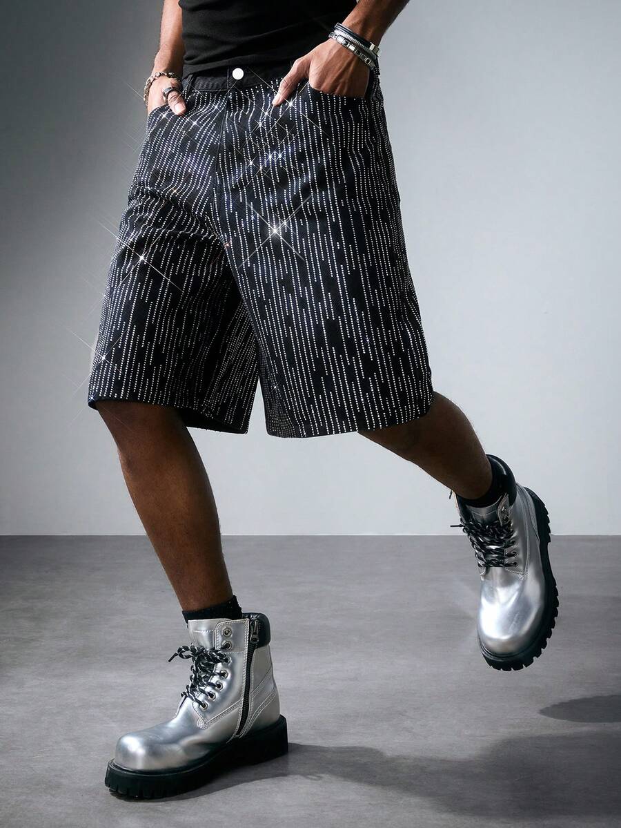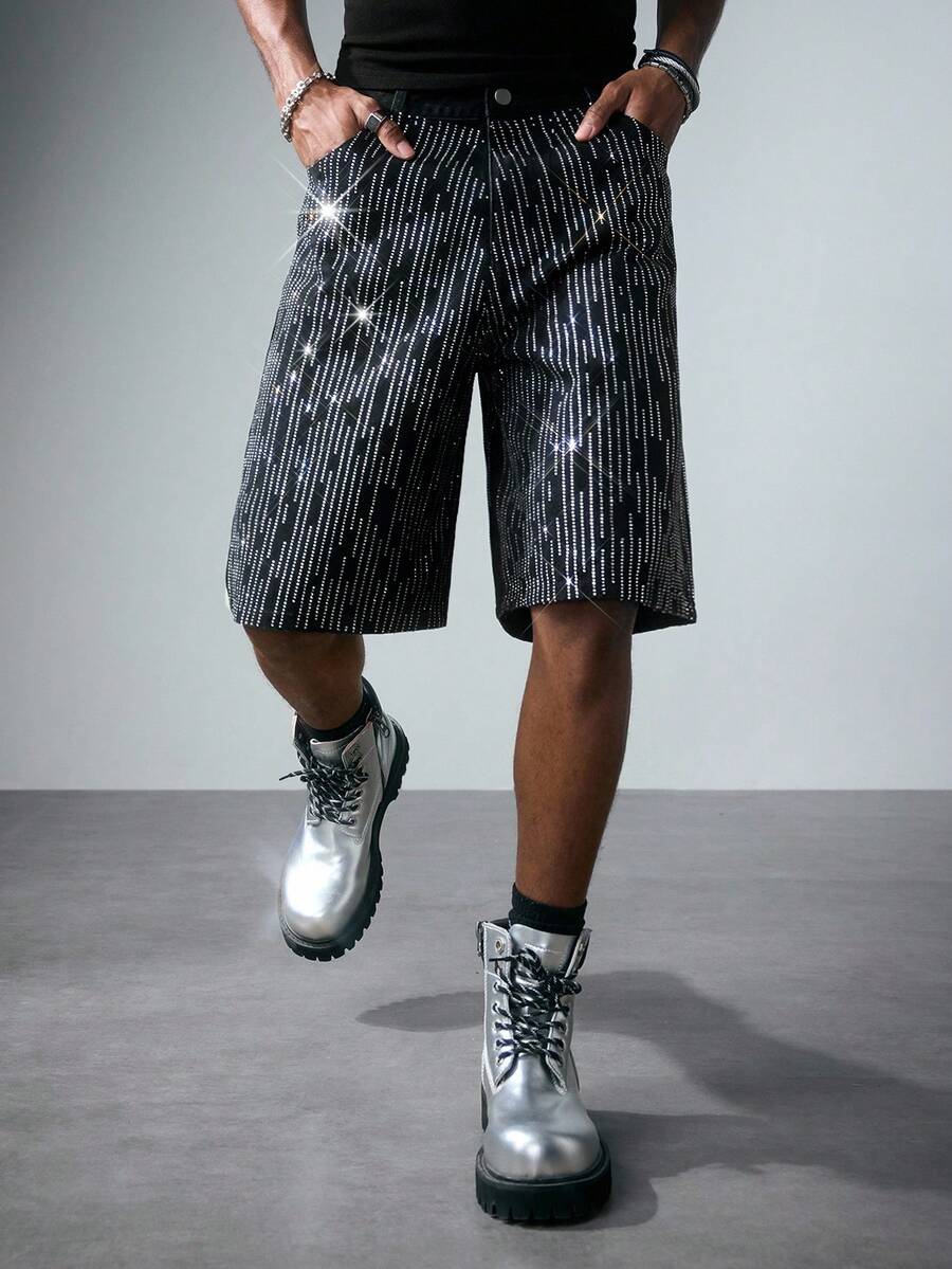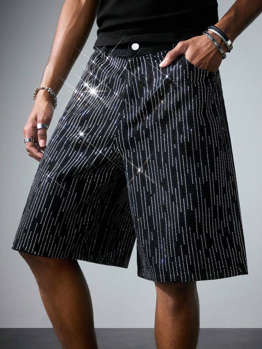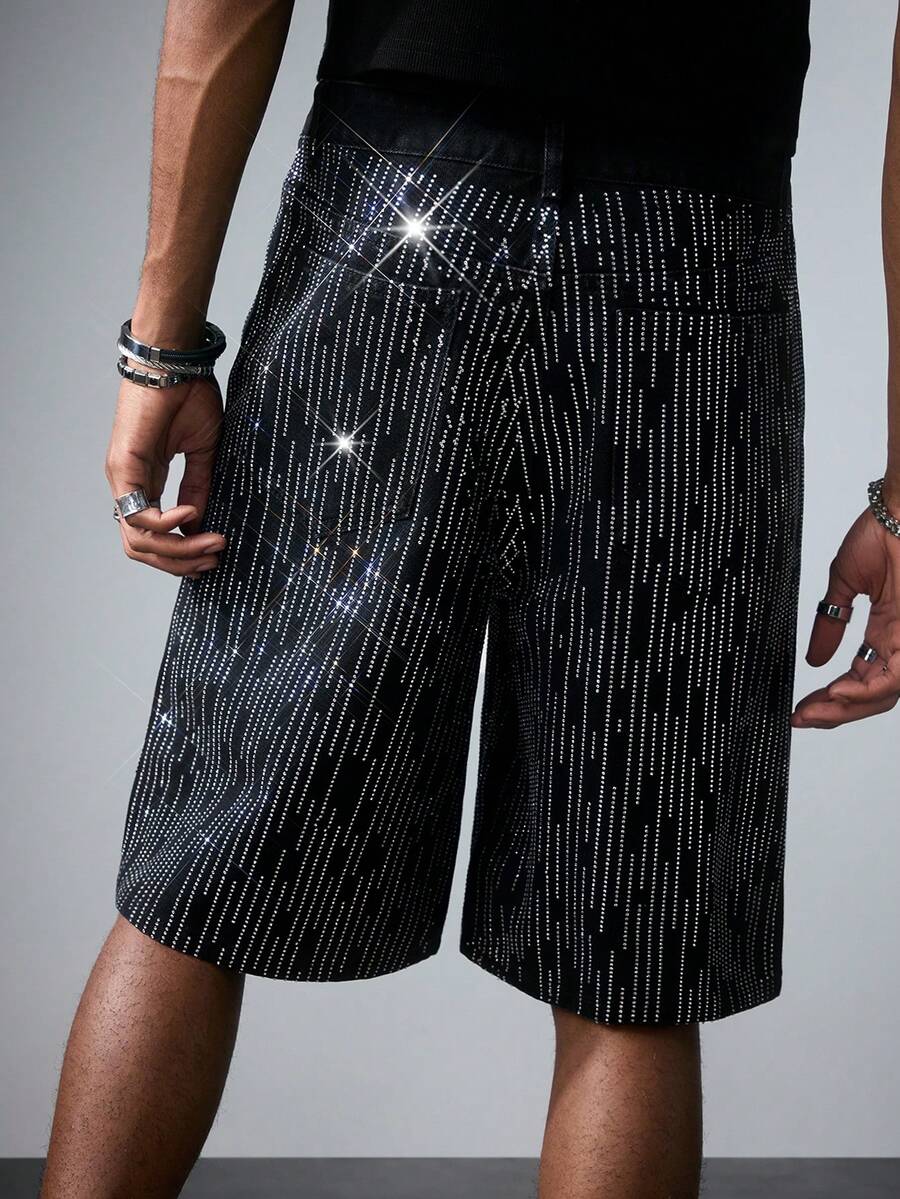 ROMWE Avant Pantalones cortos de mezclilla con diamantes incrustados, corte holgado para hombre