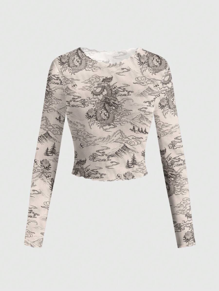 ROMWE Avant Blusa transparente de manga larga con estampado de dragón, montaña, agua, pintura de tinta, nubes y caligrafía para mujer, ideal para festivales de música en primavera/verano