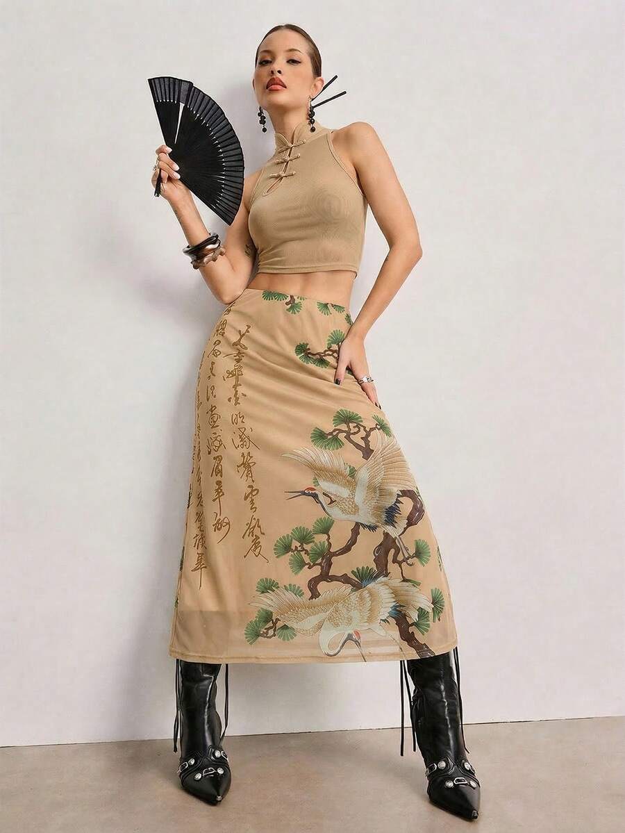 ROMWE Avant Nueva falda con abertura estampada con grulla y árbol de pino con caligrafía china, para mujer, estilo chino