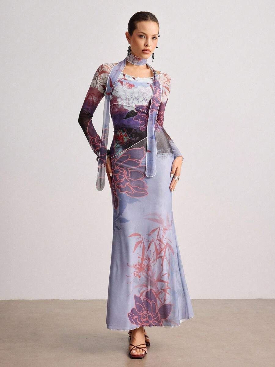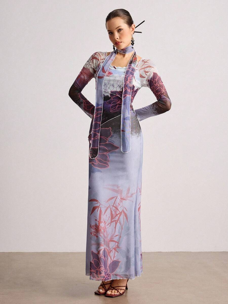 ROMWE Avant Nuevo vestido ajustado de malla con estampado de estilo chino y bufanda